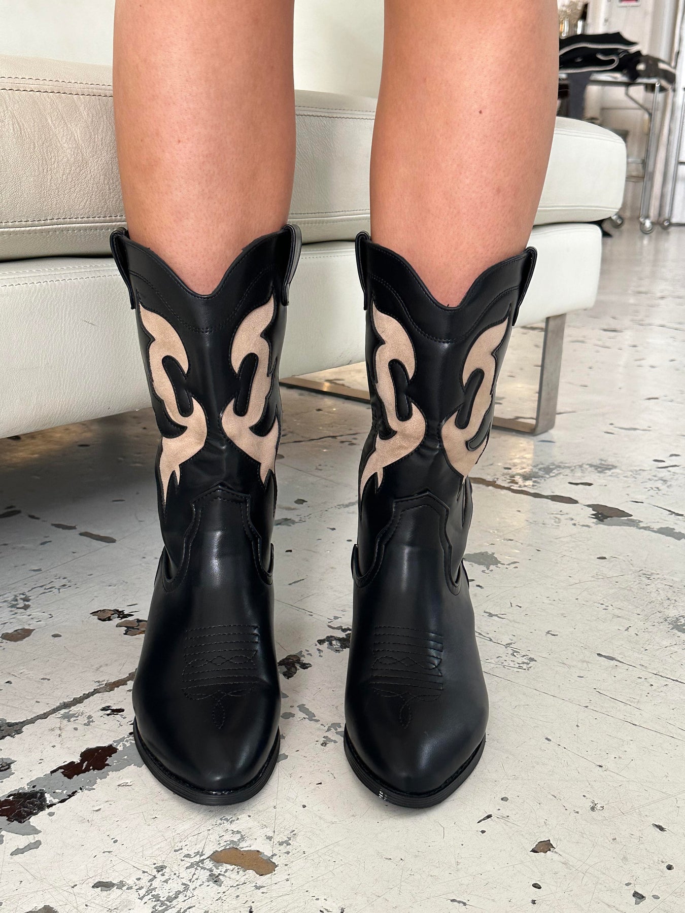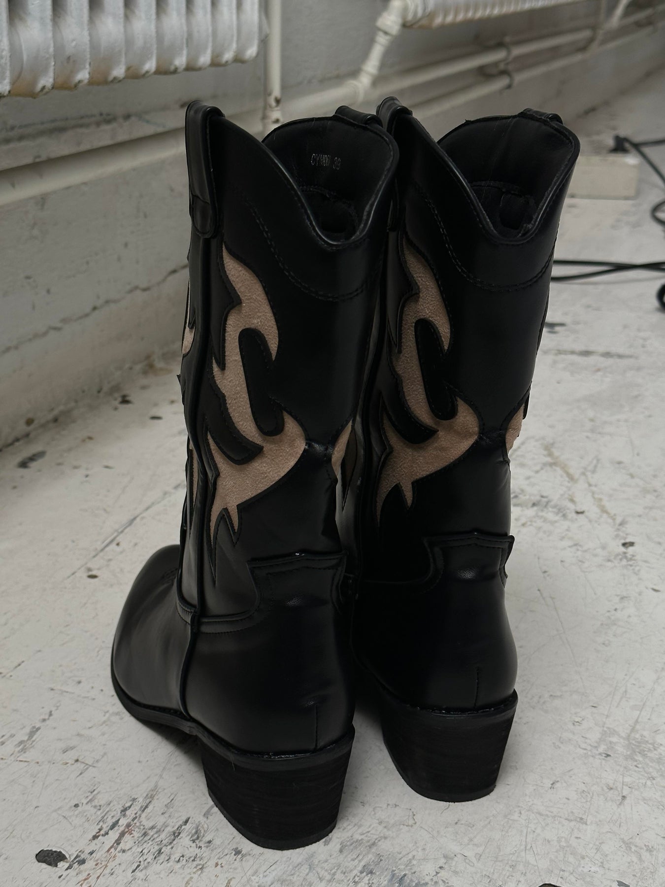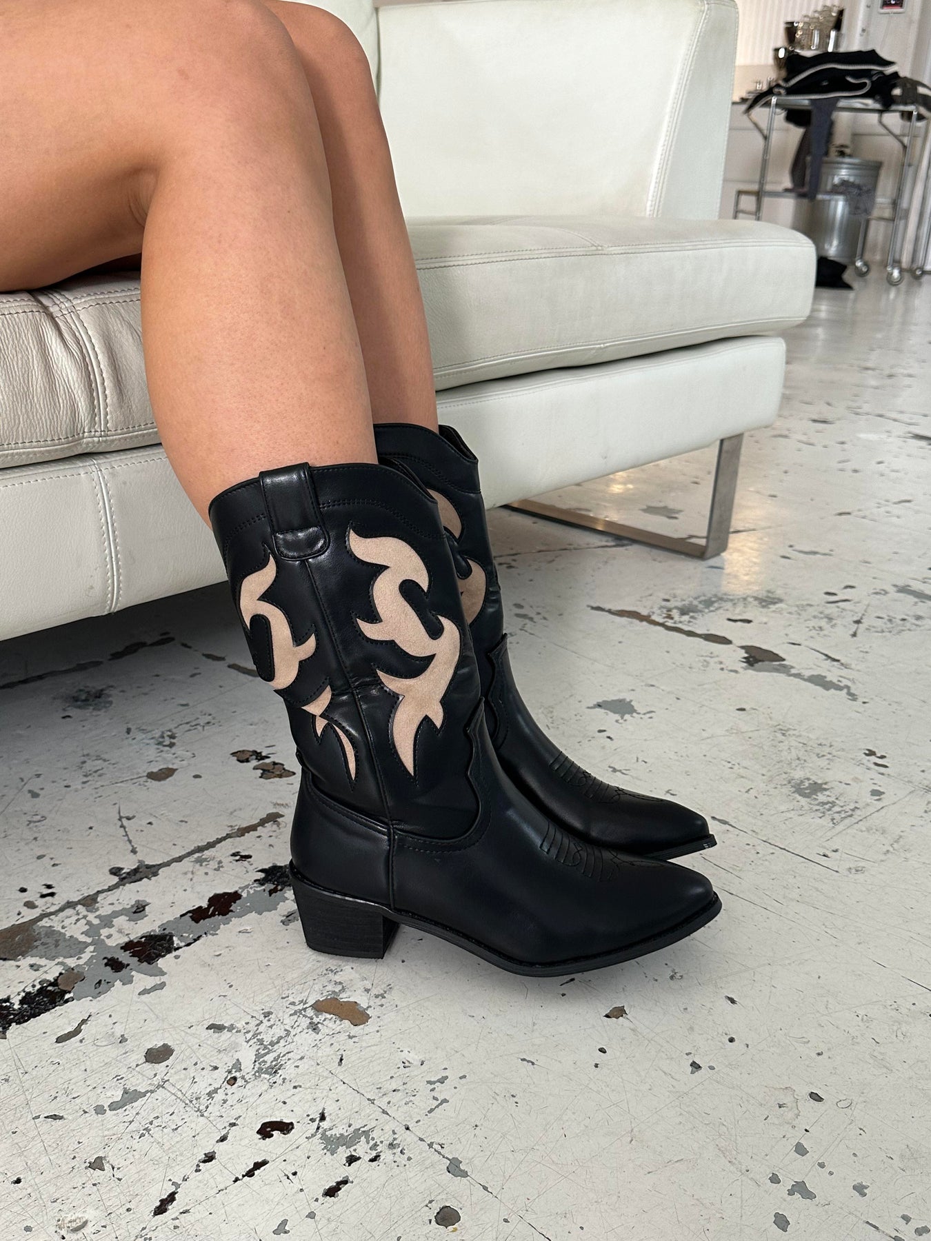 These women’s cowboy boots are styled in black with a beige pattern that introduces contrast and detail. The mid-shin cut creates a balanced outline, while the low heel keeps the silhouette grounded. Classic western elements are blended with modern proportions, making the boots versatile for different outfits. Their structured design adapts easily to both casual looks and styled occasions. A statement piece that brings bold character to everyday wardrobes.