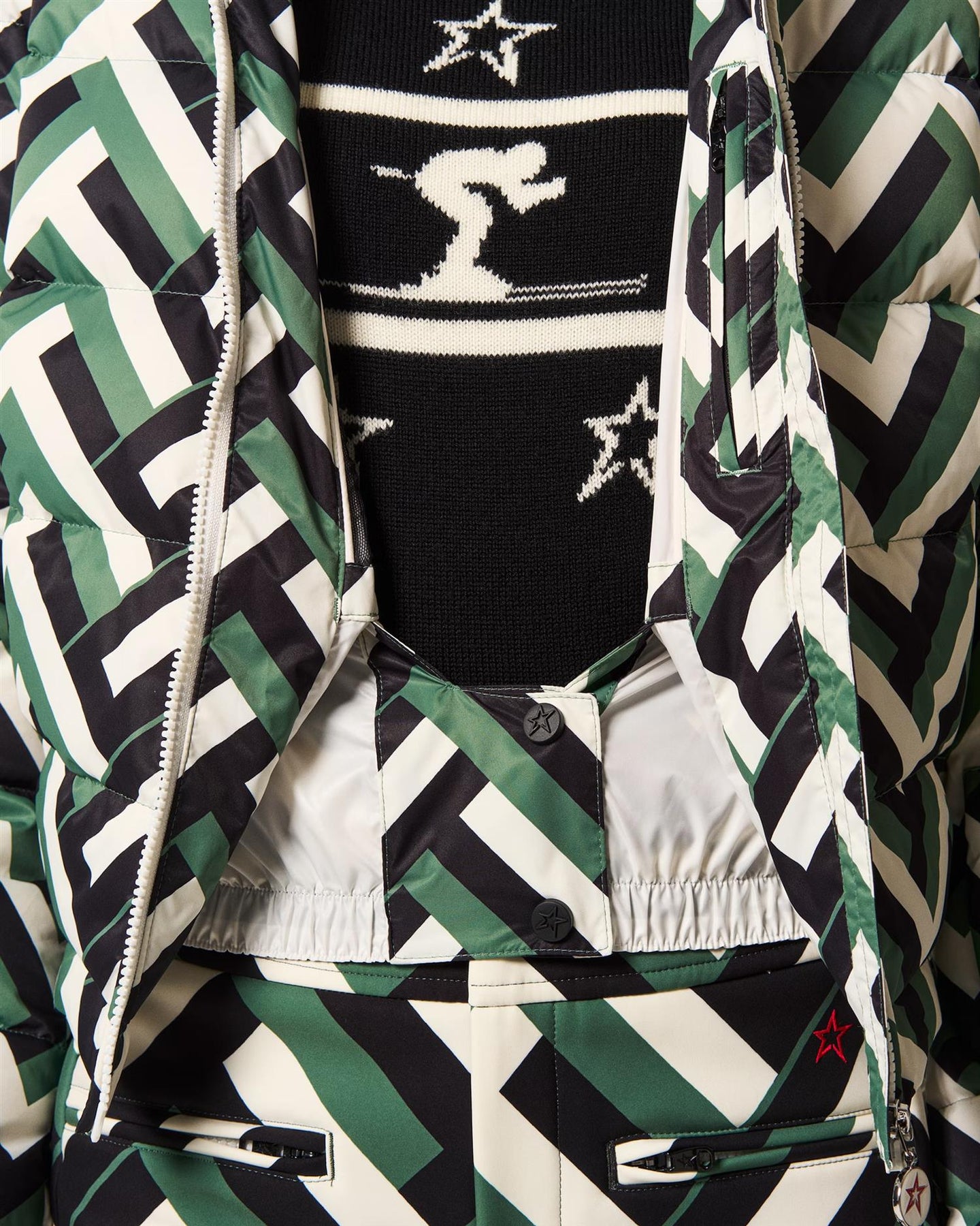 This women's jacket features a cropped, flared outline that shapes a feminine and dynamic silhouette above the hips. Its high neckline, hooded structure, and smooth proportions make it suited for alpine settings, ski days, and statement winter looks with a modern edge.