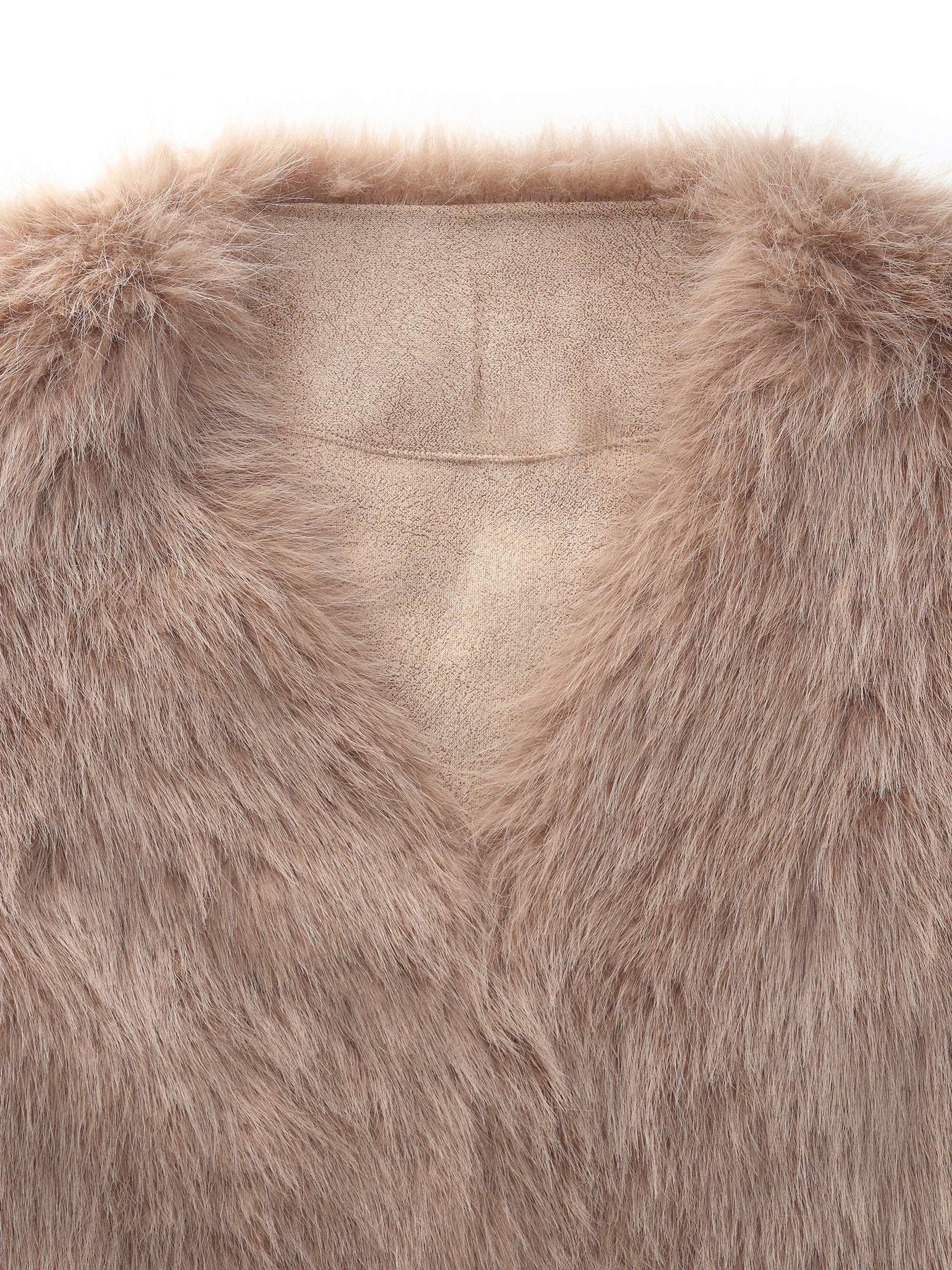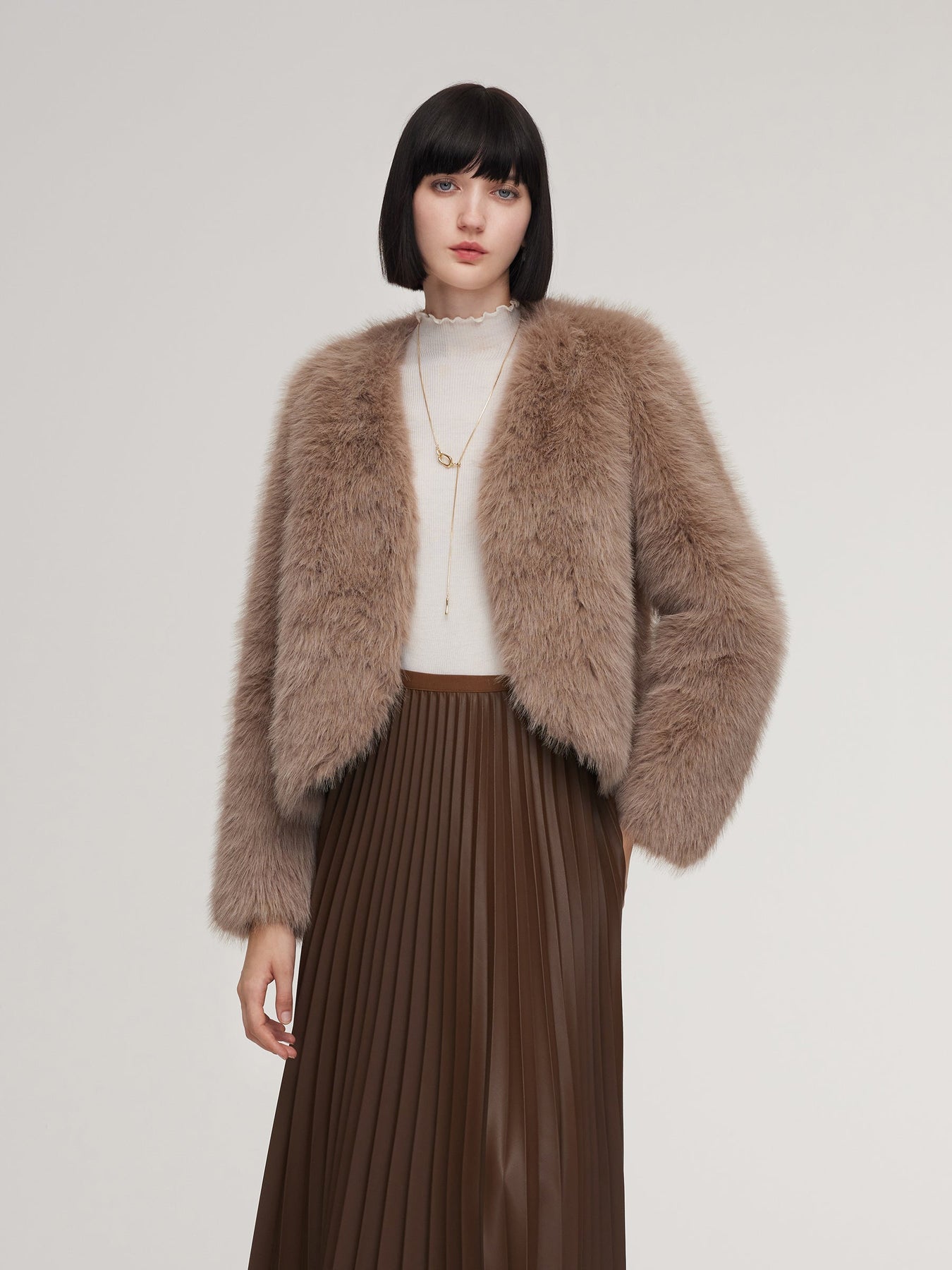 This coat features a plush, textured surface that creates a naturally full silhouette while keeping the overall shape smooth and refined. The V-neckline opens the profile for a balanced, waist-focused look, complemented by a cropped design that adds gentle structure. Side pockets blend neatly into the coat’s form, supporting function without disrupting its clean aesthetic. Ideal for cool-weather styling, it brings a composed mix of softness, contour, and everyday versatility.