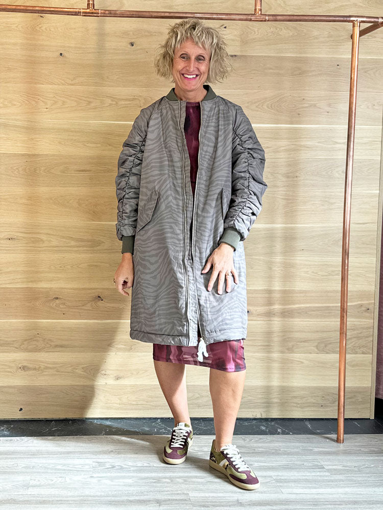 Step into standout style with the long zebra print bomber jacket, where modern design meets relaxed sophistication. This longline bomber jacket showcases a subtle zebra print, giving it a chic twist on the classic bomber silhouette. Crafted from lightweight polyester with ribbed neck and cuffs, it offers both comfort and style. The gathered sleeves, two-way zipper, and flap pockets add functional details, while the long cut creates a flattering, street-chic look that transitions seamlessly from casual days to city nights.