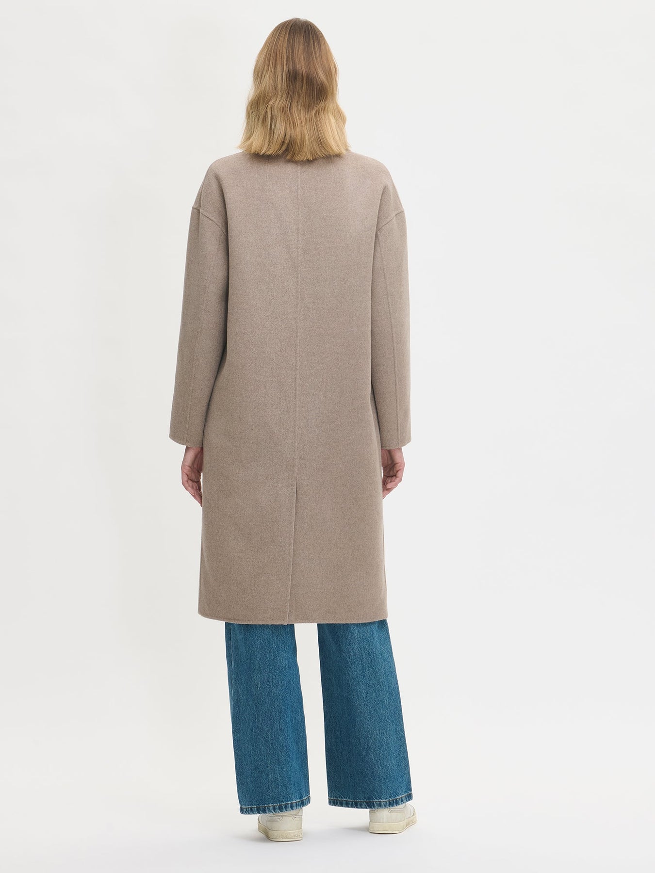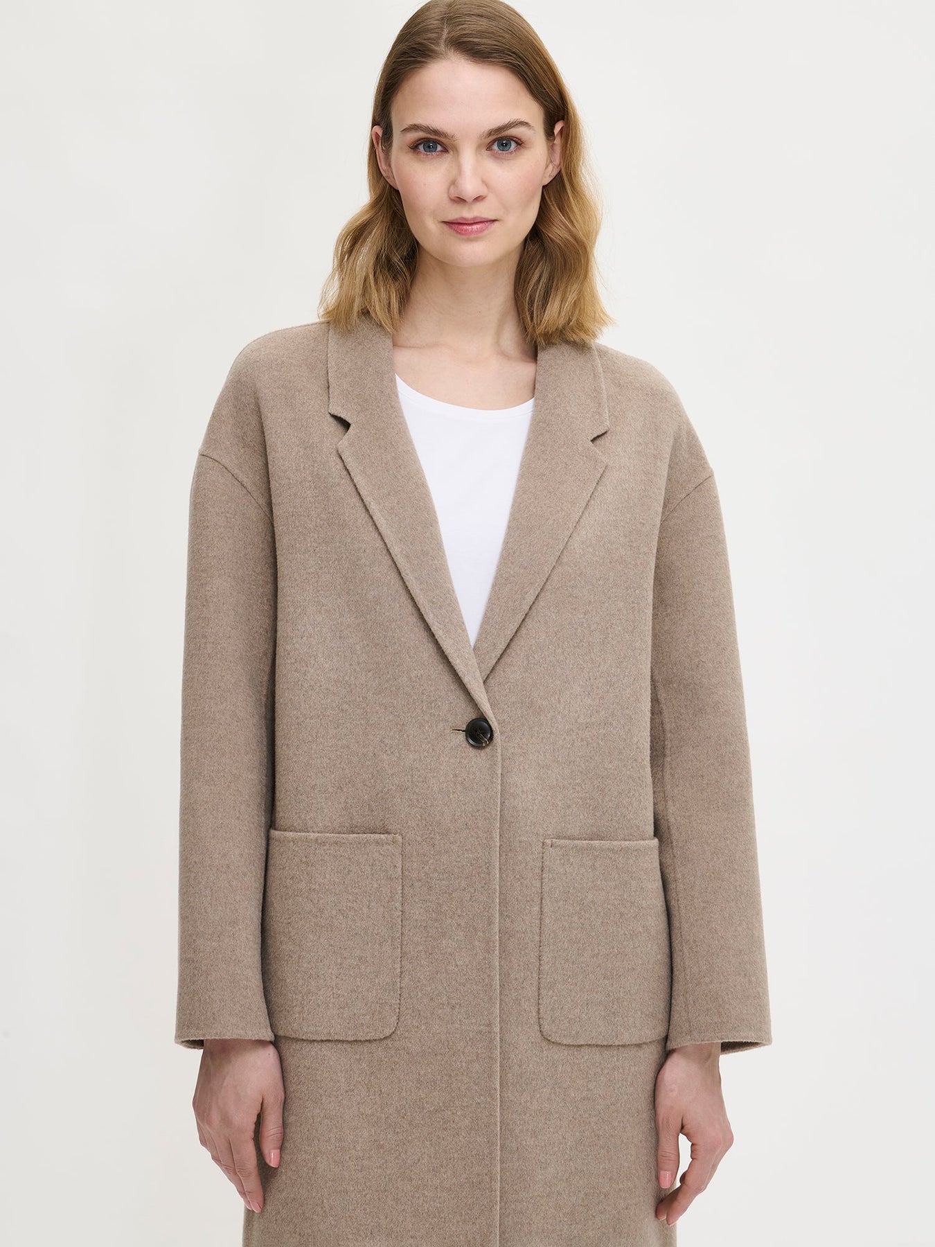 This women’s wool coat blends classic tailoring with lasting comfort, making it a true wardrobe essential. Crafted from a high-quality wool-polyester blend, it feels soft and refined while maintaining durability through the seasons. The unlined design features beautifully finished seams both inside and out, adding to its polished look. A front button closure and practical patch pockets bring functionality, while the straight cut and back vent ensure easy movement and a flattering fit. Perfect for layering over both dresses and trousers, this coat offers effortless elegance for any occasion.