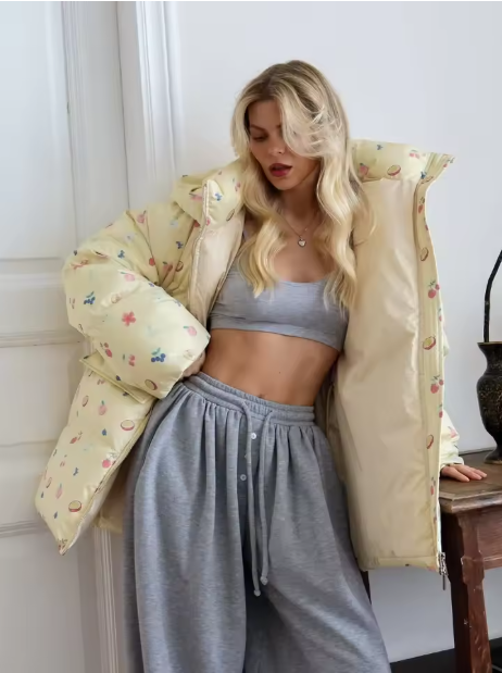 This hooded cotton jacket features a printed outer surface with a structured shape suited for everyday winter use. The stand collar and full zipper support simple layering, while the interior provides a steady, comfortable feel during colder conditions. Designed for commuting and casual settings, the relaxed cut allows easy movement and pairs smoothly with a range of seasonal outfits.