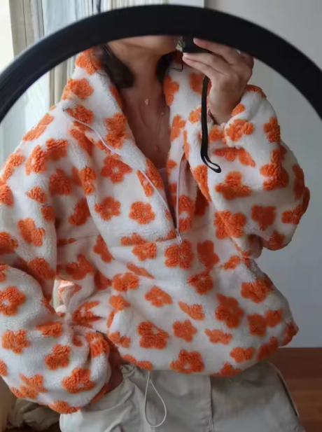 This sherpa pullover hoodie features a floral patterned surface combined with a half-zip front for simple, adjustable wear. The fleece-lined interior supports a warm, relaxed feel suited for cold-season routines, while the loose silhouette allows comfortable movement and easy layering. Its casual shape pairs naturally with daily outfits, offering a soft, practical layer for autumn and winter. Designed for effortless comfort, it provides warmth with a gentle, laid-back look.