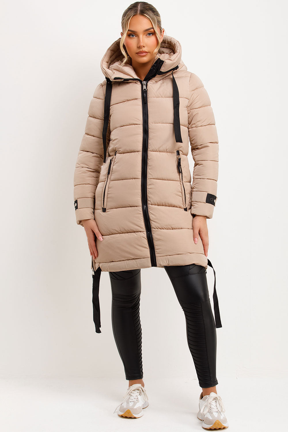 Joelle | Women’s long hooded puffer coat with side strap detail