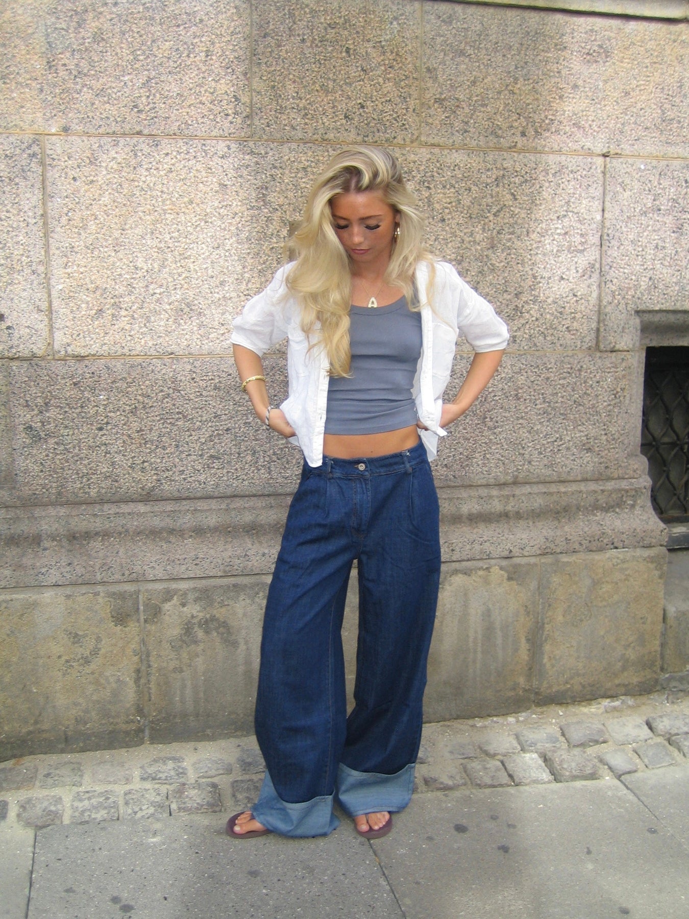 The Deia jeans are designed with a folded hem at the bottom, adding a unique and structured detail to the silhouette. The loose and oversized fit creates volume while keeping the proportions balanced. A low waist shapes the outline with a contemporary profile. Belt loops and a front button with zip fastening provide a practical finish. A statement piece suited for casual outfits and street-inspired looks.