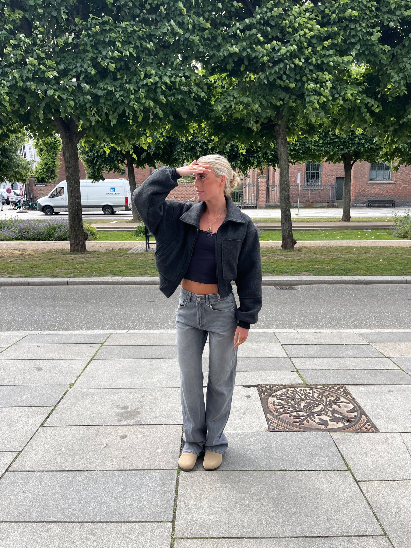 • Balanced fit: Loose straight-leg silhouette with mid-waist cut.