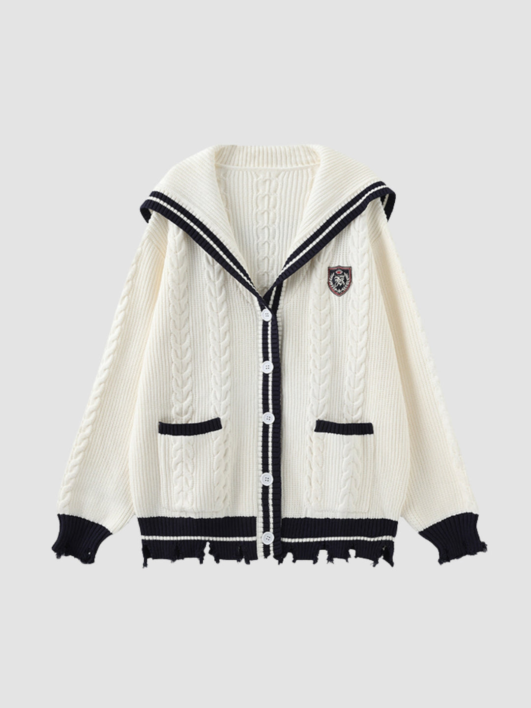 Mille | Women’s long knit cardigan with navy collar and button closure