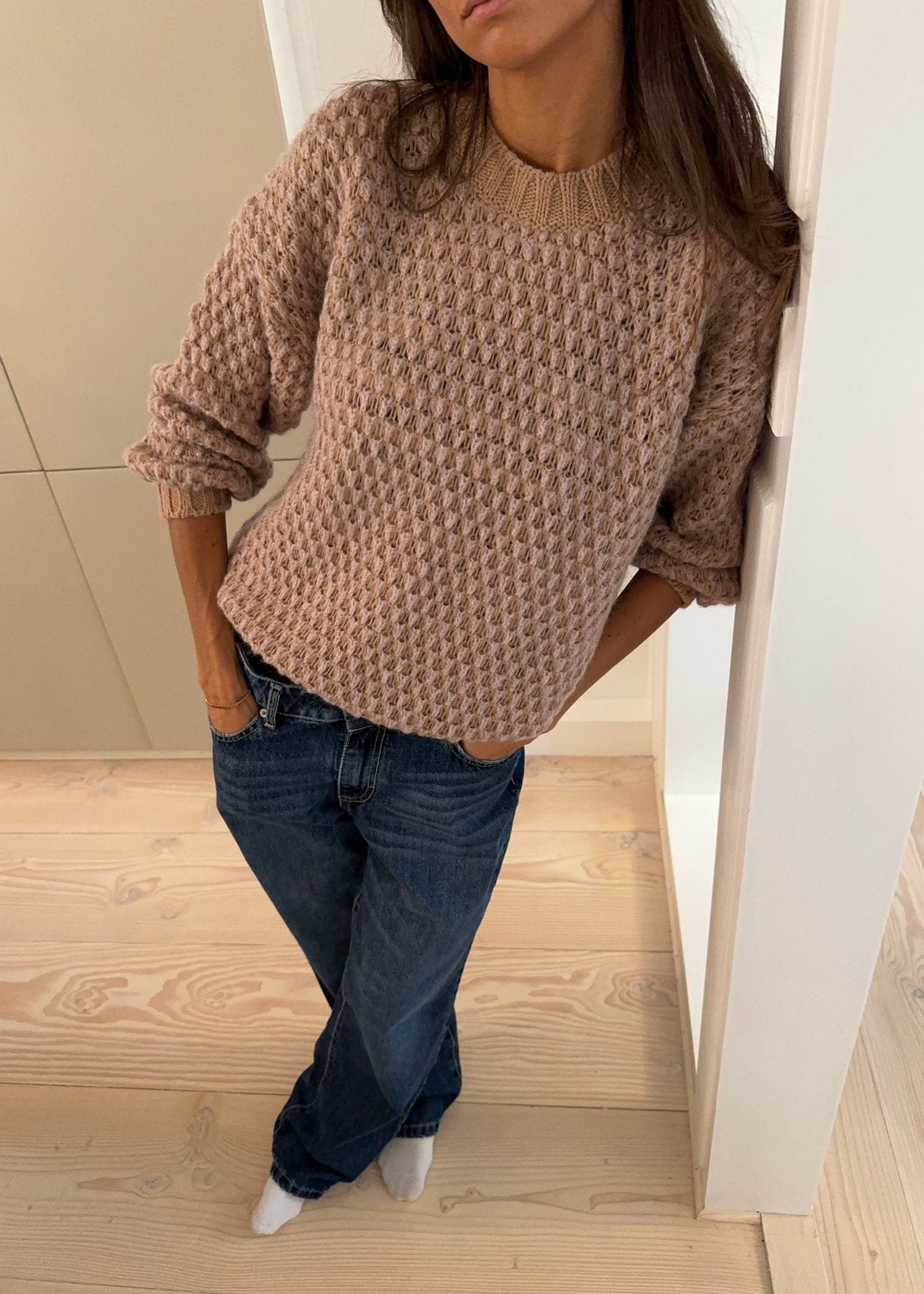This women’s sweater is designed with a loose fit and long sleeves that create a relaxed silhouette. Ribbed detailing at the neckline and cuffs introduces subtle structure while keeping the shape refined. Its versatile outline makes it suitable for layering or wearing as a standalone piece. The proportions adapt easily to both casual styling and more elevated outfits. A transitional design that works across different occasions and seasons.