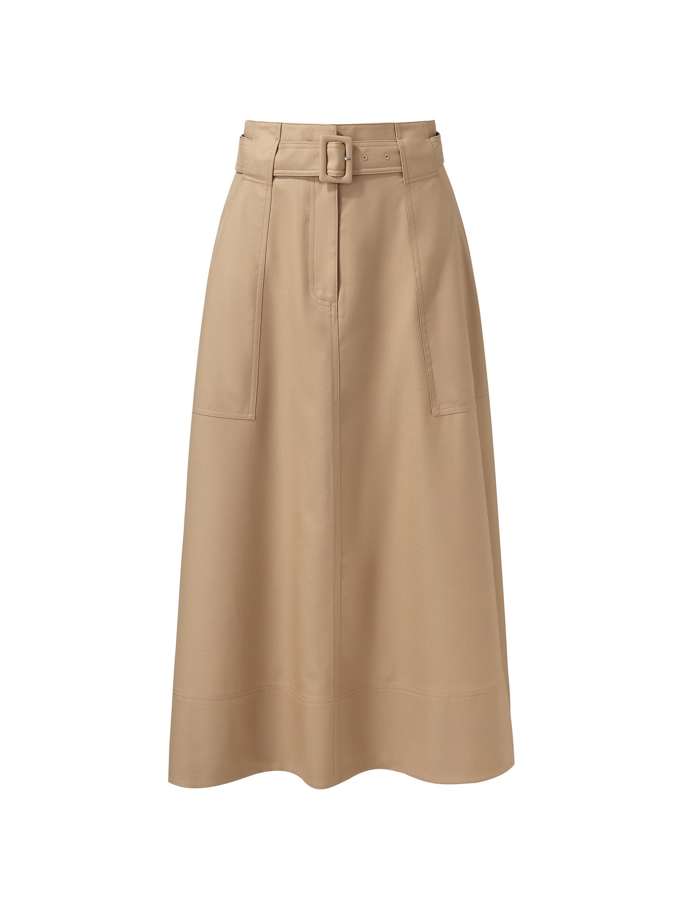 Crafted from 100% premium merino wool, this light camel A-line skirt brings effortless elegance and warmth to your wardrobe. Designed with a cinched waist and flared hem, it flatters a variety of body types while maintaining a structured, graceful drape. A matching belt defines the waistline for a refined finish, while the functional side pockets add everyday practicality without compromising style. Whether paired with a crisp blouse for the office or a soft knit for weekends, this skirt moves seamlessly between occasions.