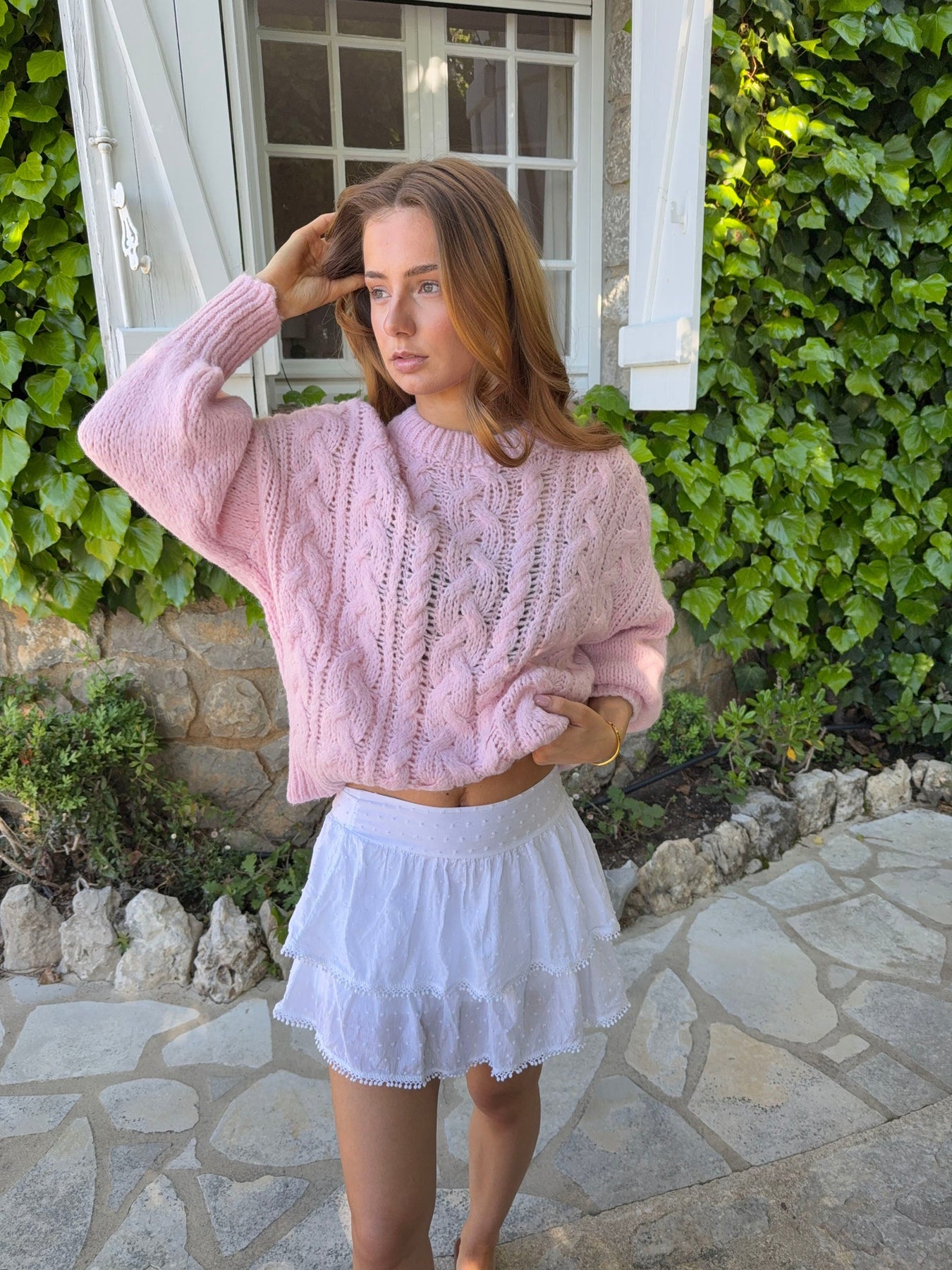 This knit sweater combines the timeless appeal of cable knit with a silhouette designed for contemporary styling. Its relaxed outline is enhanced by voluminous balloon sleeves, bringing balance and character to the look. A wide ribbed hem adds definition at the waist, ensuring a flattering finish. Styled in dusty pink, it offers a soft color accent that adapts easily to both casual and elevated outfits. Perfect for layering or wearing as a statement piece, this sweater captures a blend of tradition and modernity.