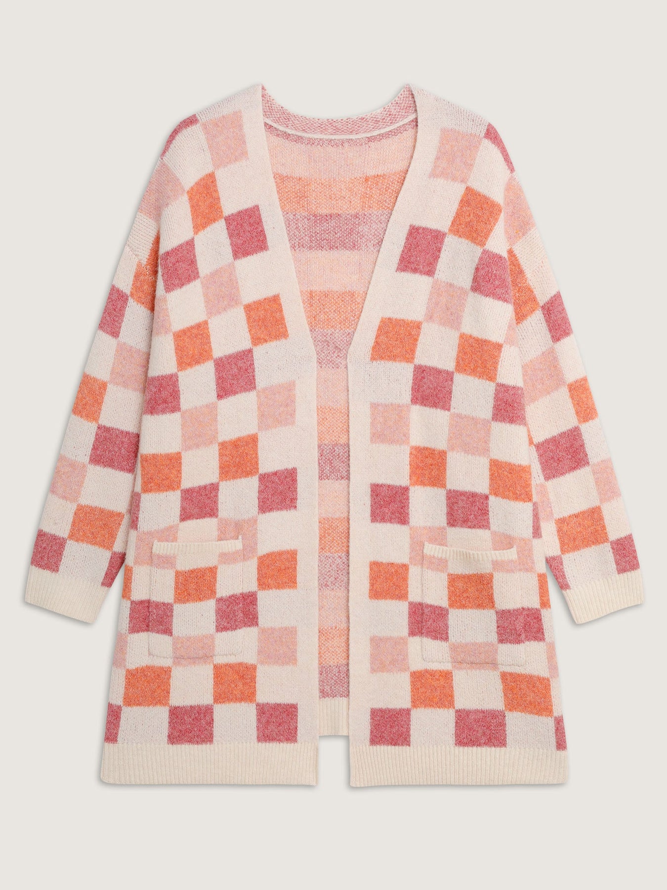 Shop the women’s checkered contrast knit cardigan and embrace a look that’s both cozy and stylish. Designed with an open-front silhouette, this cardigan offers effortless layering for any casual outfit. The playful plaid pattern and soft knit texture bring warmth and personality to your wardrobe. Featuring long sleeves, front patch pockets, and a comfortable relaxed fit, it’s the perfect piece for transitional weather or laid-back days.