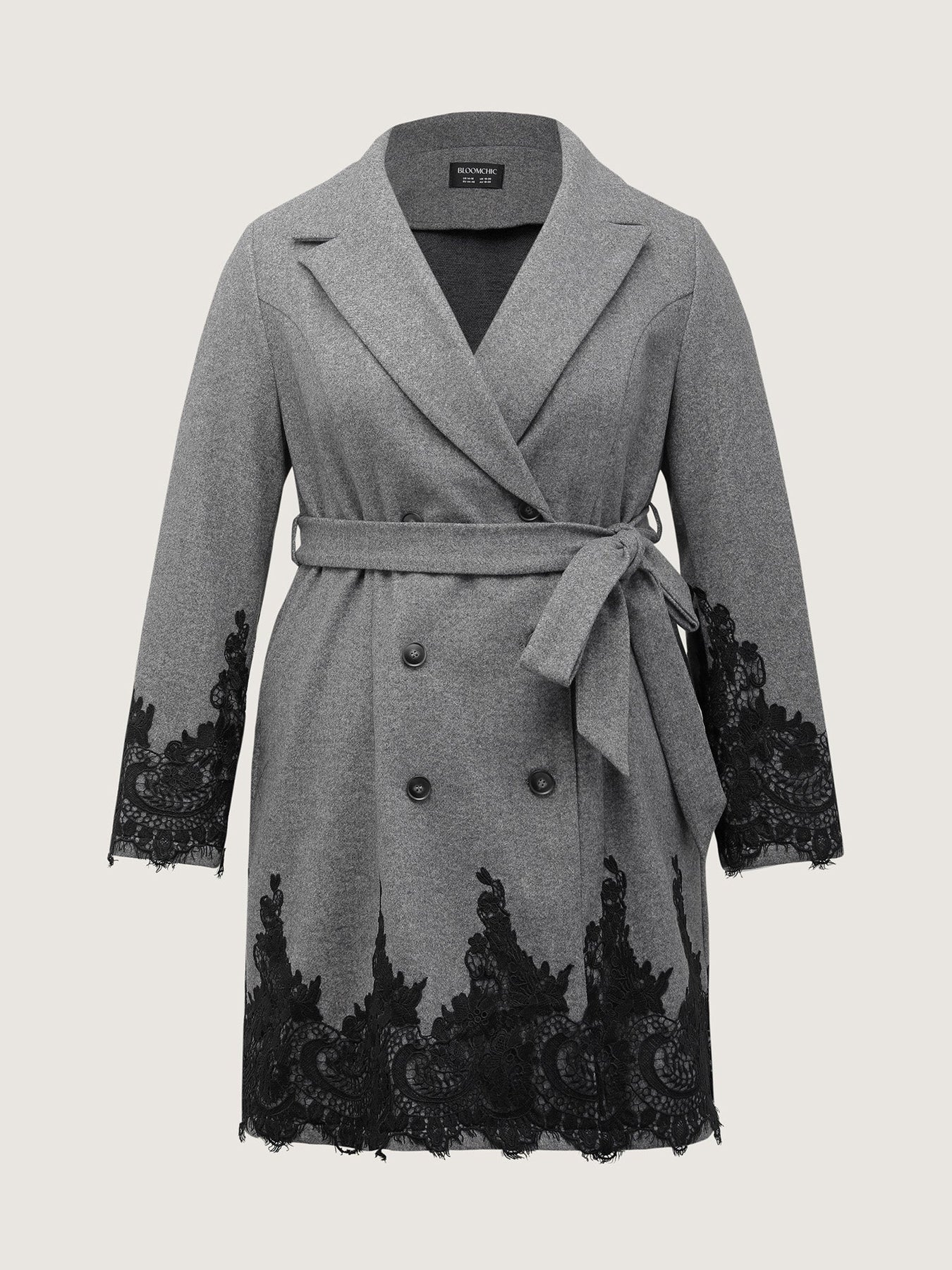 This women’s color contrast belted lace coat combines timeless sophistication with feminine charm. Designed with delicate lace detailing on the sleeves and hem, a flattering belted waist, and a double-button front, it offers a refined silhouette perfect for any occasion. The tailored fit and elegant contrast trim make this coat a standout piece for your outerwear collection.